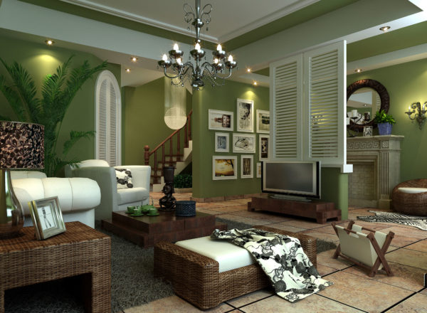 Si la pièce est très lumineuse, il est permis de diluer la couleur olive avec toutes les nuances de vert, créant ainsi un intérieur écologique. Vous pouvez ajouter des plantes d'intérieur vivantes ou poser un tapis imitant l'herbe.