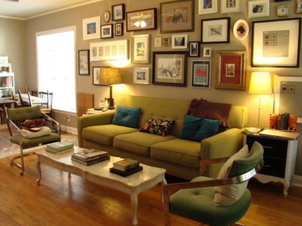 Vous pouvez ajouter des éléments décoratifs légers à la conception de la pièce, par exemple, s'il y a des murs olive et des meubles rembourrés recouverts de tissu brun, puis en ajoutant du blanc, les oreillers du canapé dilueront le jeu de couleurs.