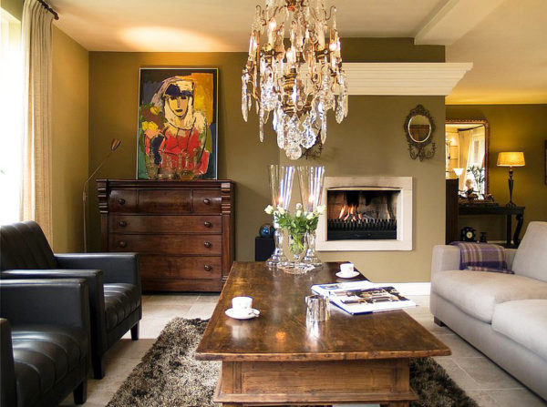 La couleur olive semble très noble si elle est combinée avec du brun. Cependant, il faut faire attention ici, car le marron dévore également beaucoup de lumière. Mais pour vraiment corriger la situation, il est possible d'ajouter de l'éclairage, par exemple en suspendant un lustre ajouré avec un grand nombre d'ampoules.
