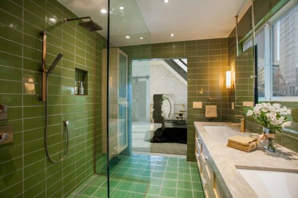 Au lieu de carreaux, vous pouvez acheter une plomberie de couleur olive et peindre les murs en beige clair. Ce sera extraordinaire et vraiment luxueux.