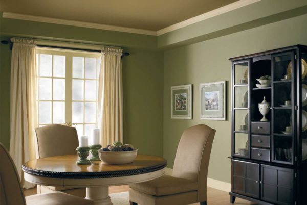 Accrochant des toiles en civières blanches sur les murs, nous obtenons une chambre conçue dans le style classique. Mais il est préférable de combiner la couleur olive avec le chocolat lorsque la pièce est très ensoleillée et dispose de plusieurs fenêtres. Et même alors, s'ils partent vers le sud.