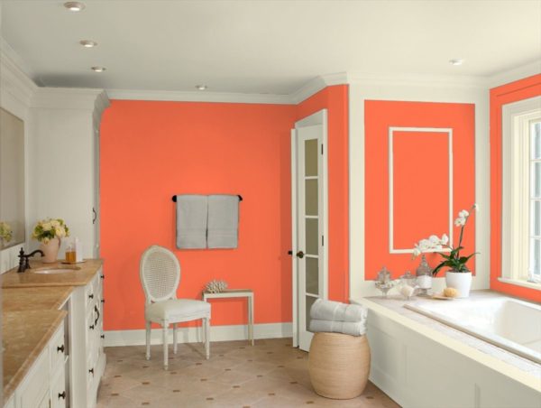 Dans cette couleur, vous pouvez également concevoir la base de la baignoire. Mais avec un évier et des accessoires, vous ne devriez pas en faire trop. Si le propriétaire veut acheter la plomberie de cette teinte, il vaut mieux que les murs soient faits de lumière, pas de pêche.