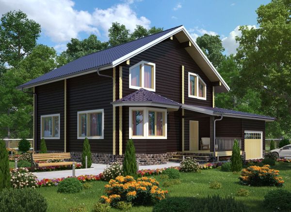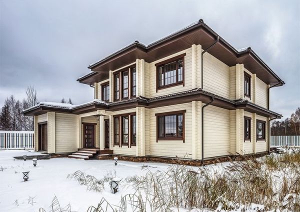 Par exemple, à partir de poutres collées peintes en couleur brun foncé, vous pouvez obtenir une très belle maison à deux étages pour une résidence permanente. Un balcon ouvert avec une structure en bois sombre se penchera idéalement près de la fenêtre au deuxième étage.