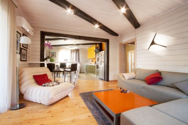 - Tout d'abord, la surface ne doit pas être cachée sous d'autres matériaux, car le bois lui-même crée une beauté incroyable, qui est mieux utilisée à bon escient. De plus, le bois d'œuvre a de nombreuses qualités différentes. Ce matériau est respectueux de l'environnement pour la santé, et lorsqu'il est doublé d'autres matériaux, ses propriétés sont tout simplement proches.