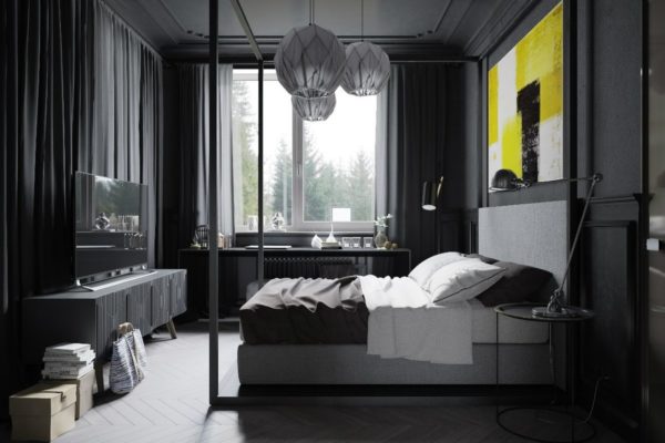Dans les intérieurs masculins, le gris est le plus souvent utilisé pour concevoir les armoires de maison, les chambres ou les salons, sans oublier de le combiner avec d'autres couleurs «masculines»: bleu foncé, écarlate, marron.