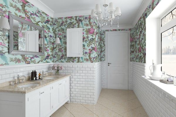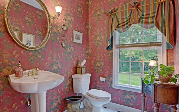 - Dans la salle de bain sur les murs peut être du papier peint! Poisson graphique combiné avec des murs roses. Chaque fois que je veux sourire, aller dans la salle de bain!