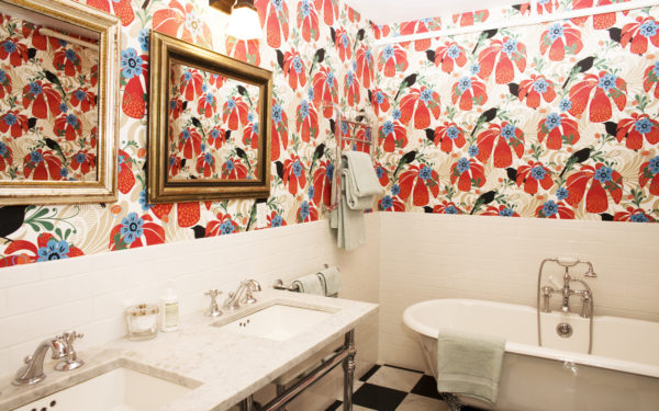 - Dans la salle de bain sur les murs peut être du papier peint! Poisson graphique combiné avec des murs roses. Chaque fois que je veux sourire, aller dans la salle de bain!