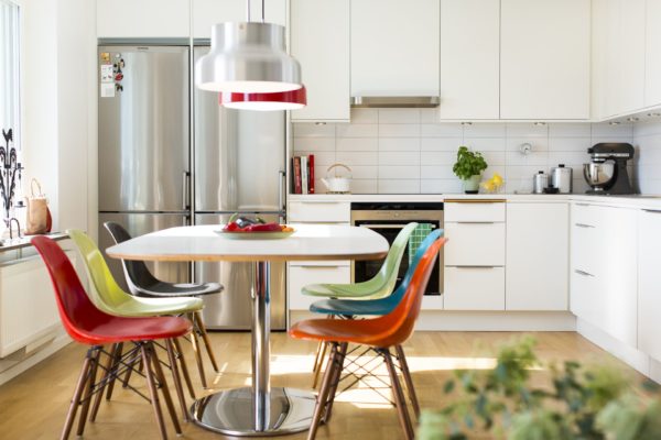 - Dans la cuisine - autour de «l'île» - différentes couleurs et formes de chaises.