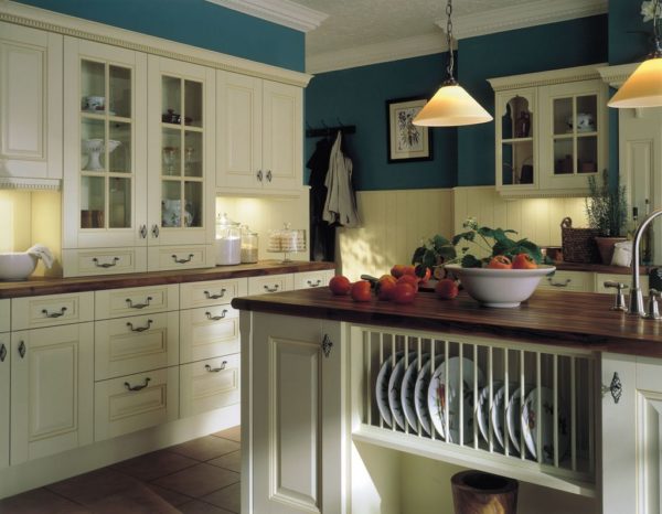 Les classiques en combinaison avec l'ivoire pour la cuisine elle-même permettent des nuances profondes de rouge et bleu, marron et vert, malachite pour les murs.