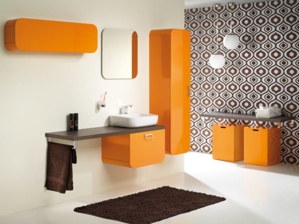 La couleur orange est parfaite pour les intérieurs de jeunes et les optimistes tout simplement incorrigibles. Si vous voulez créer une ambiance printanière dans votre salle de bain, peignez les murs en orange et renforcez-la avec des accents lumineux de vert clair, bleu et rouge.