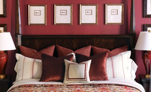 Quelques solutions toutes faites pour la chambre à coucher avec différents degrés d'utilisation de la couleur de Marsala:
