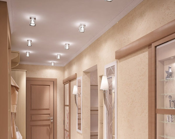 - Si vous utilisez les bonnes couleurs pour la décoration, mais ne pensez pas à l'éclairage, la pièce restera étroite et pas confortable. Il ne doit pas y avoir de zones sombres, nous utilisons donc non seulement un lustre au plafond, mais également des spots intégrés.