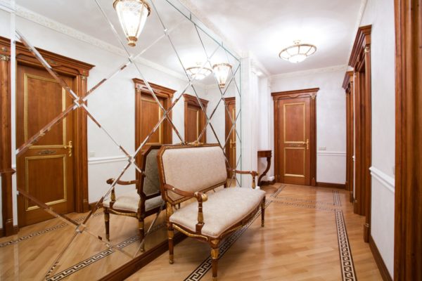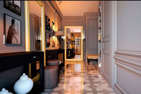 - La solution gagnante dans l'aménagement de ces pièces est le zonage. Ici, vous pouvez séparer la porte d'entrée de la partie de la pièce où les meubles et les miroirs seront situés. Vous pouvez sélectionner une zone pour ranger l'armoire et une zone d'espace libre. L'assistant dans cette décision sera la conception différente du sol et des murs.