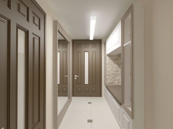 - L'élargissement visuel de l'espace est la règle principale à prendre en compte lors de la conception d'un couloir étroit. Ainsi, avoir peint le plafond dans des couleurs sombres ou utiliser des systèmes à charnières transformera immédiatement un couloir exigu en une pièce confortable.