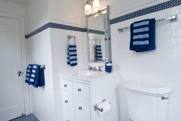 Le style marin en blanc et bleu est l'option la plus avantageuse pour les petites salles de bains. Une telle combinaison de couleurs augmente visuellement l'espace et la pièce devient plus confortable. Si vous utilisez des couleurs douces, la salle de bain ne «pressera» pas la personne, mais commencera plutôt à lui donner un sentiment de confort.