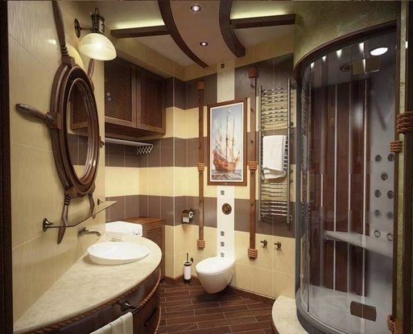 - Si nous considérons la question d'une plomberie appropriée, le classique prend le dessus. La plomberie, réalisée sous la forme de formes géométriques strictes, ne correspond pas à l'intérieur «marin». Partout, il devrait y avoir des lignes douces.