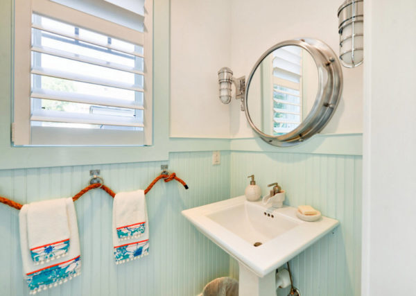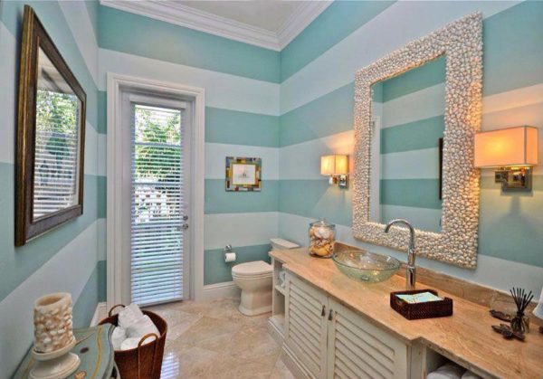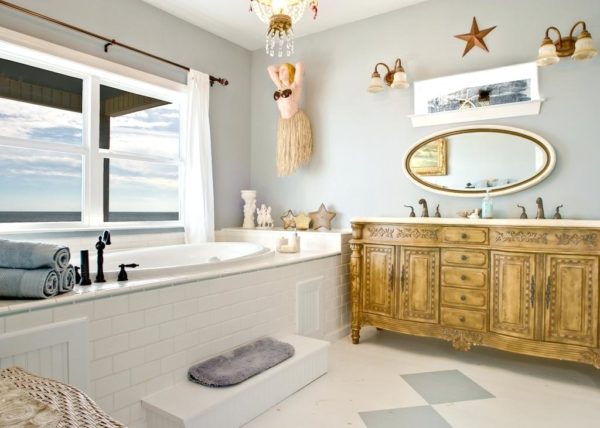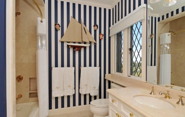 Le style principalement marin est utilisé sur les surfaces - ce sont les murs, le plafond et le sol. Si vous faites tout avec style, vous obtenez une pièce complètement originale. Après avoir dilué tout cela avec des meubles appropriés, vous vous sentirez vraiment au bord de la mer.