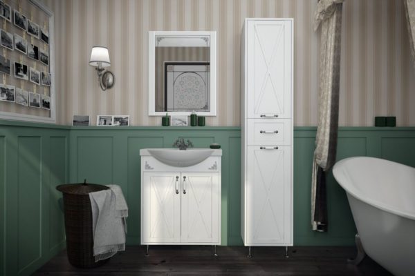 Comme nous l'avons déjà dit, solide, massif, naturel avec de nombreuses étagères. Les portes des armoires sont souvent en verre avec un motif géométrique simple posé. Le fond peut être de grands tiroirs où divers accessoires de bain sont empilés.