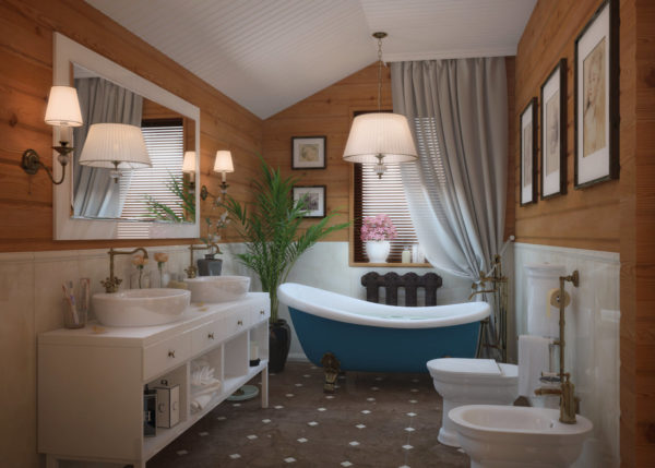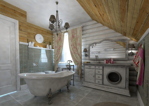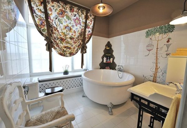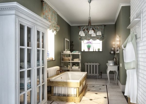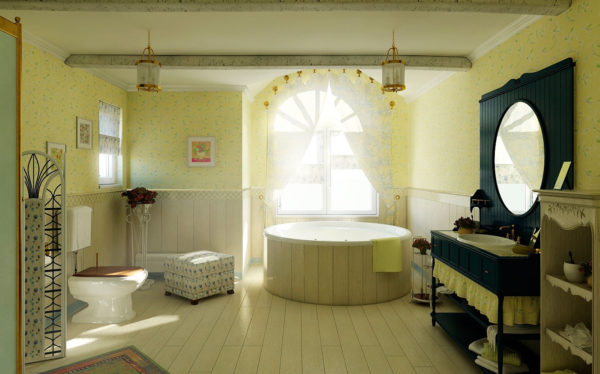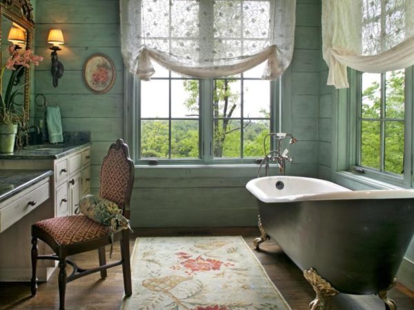 Une baignoire dans le style provençal avec une fenêtre panoramique est particulièrement élégante, allongée dans un tel bain, il est tout à fait possible de se livrer à une grande variété de rêves, relaxant votre âme et votre corps.
