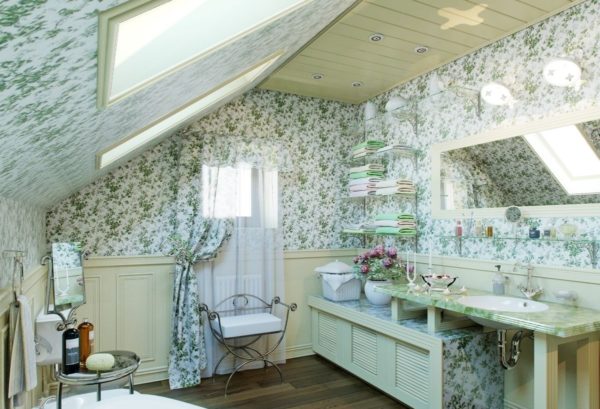 Comme la conception générale d'une salle de bain dans le style provençal n'accepte pas de matériaux modernes de haute technologie, ainsi que l'utilisation de technologies de finition modernes, et la conception du plafond en particulier.