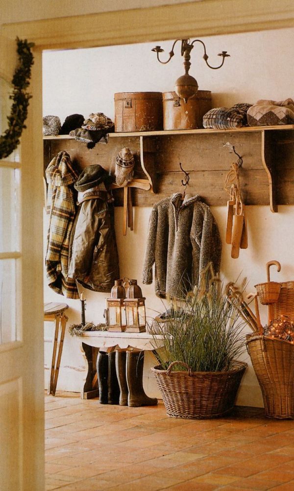 Pour une maison de campagne ou un hall de style champêtre, des planches de bois sont utilisées. Le degré de traitement dépend du goût, cependant, la texture naturelle doit toujours être en vue. Les crochets doivent être attachés à la planche, la planche au mur.