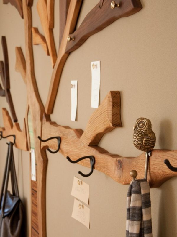Si le lecteur n'est pas indifférent à l'éco-style, alors un cintre unique fait de branches, de coupes ou d'un arbre stylisé décorera efficacement le couloir de l'appartement. La résistance du matériau doit être vérifiée en fixant les crochets et en les identifiant sur le mur.