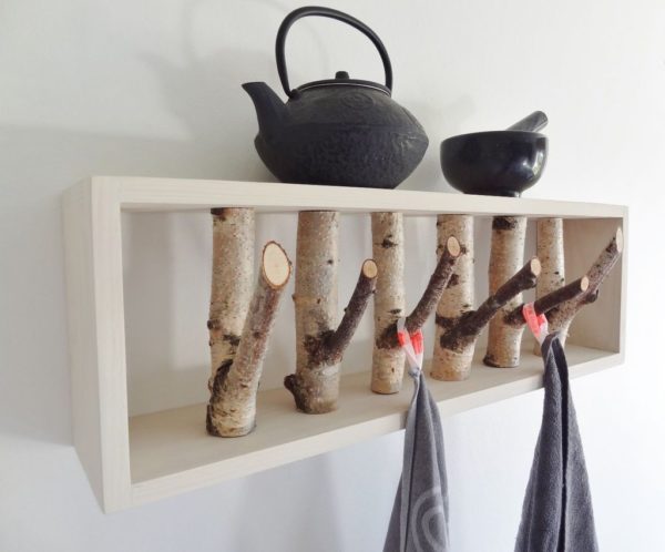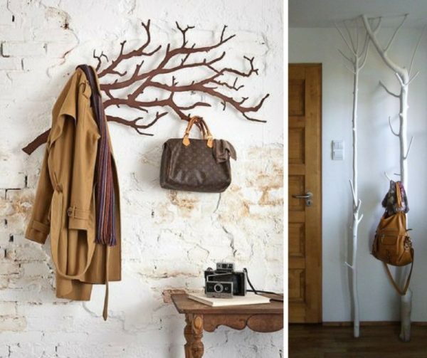 Si le lecteur n'est pas indifférent à l'éco-style, alors un cintre unique fait de branches, de coupes ou d'un arbre stylisé décorera efficacement le couloir de l'appartement. La résistance du matériau doit être vérifiée en fixant les crochets et en les identifiant sur le mur.