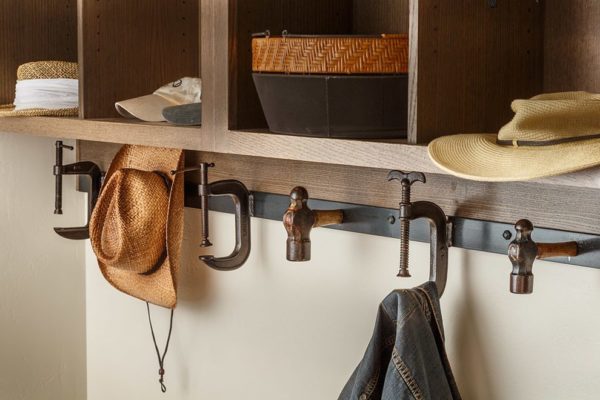 Cintres sur le mur à partir de crochets ordinaires avec des détails décoratifs
