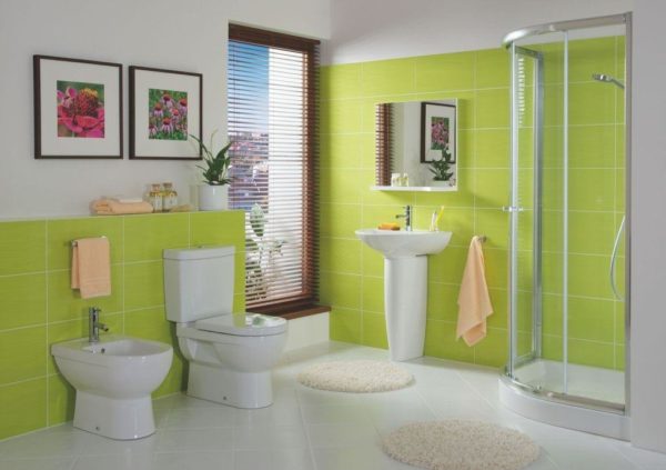 Le vert n'est pas très beau dans la salle de bain, en particulier dans les couleurs sombres, car il vous donne l'impression d'être dans un marais. Par conséquent, les recommandations sont les suivantes: le vert doit être combiné avec des tons chauds - pêche, jaune, orange.