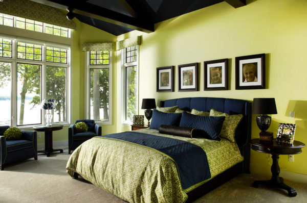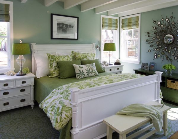 La conception de la chambre en vert aura un effet bénéfique sur le système nerveux, donnera une sensation de calme et de tranquillité. Il est préférable de décorer les murs avec du vert terne, les rideaux choisissent les couleurs de la vague de la mer, combinés avec un lit vert pâle.