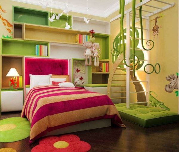 La couleur verte dans la chambre des enfants ne doit pas être basique, car son excès n'est pas très bon pour l'humeur de l'enfant. Le plus favorable sera une combinaison de nuances chaudes de vert avec jaune orangé.