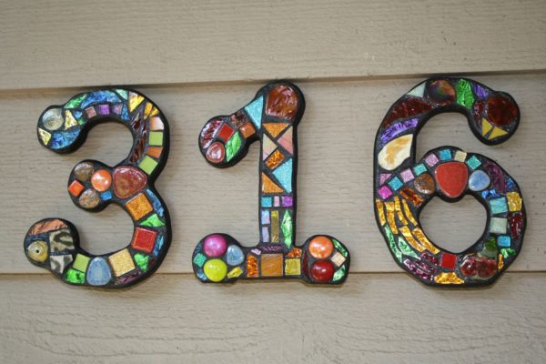 La mosaïque semble inhabituelle. À partir de matériaux improvisés, vous pouvez créer de véritables œuvres d'art. De tels signes susciteront l'intérêt des passants et apporteront de la joie aux propriétaires de la maison.