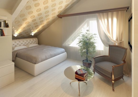 Si l'angle du toit est petit, dans le grenier, vous pouvez organiser une chambre. Pour la conception, tout style convient. Il est important de tenir compte de la hauteur de la pièce et d'éviter les gros meubles. Tout d'abord, la salle est remplie avec le plus nécessaire, seulement alors les places vides sont remplies de bagatelles.