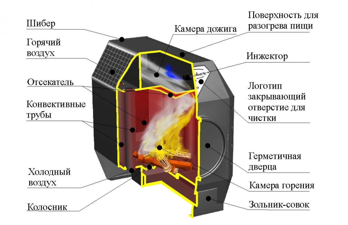 Buleryan est un cylindre métallique avec des jambes, avec un système de canaux d'air. Le tuyau buleryan sort à un angle, ce qui assure l'élimination de la fumée et la préservation de l'air chaud. Les conduits d'air communiquent avec la tuyauterie de la pièce. L'air chauffé circule à travers les tuyaux, dégageant de la chaleur.