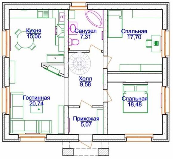 Au lieu de chambres pour enfants, vous pouvez aménager un espace de travail ou une chambre d'amis, organiser une salle à manger dans la salle commune, réduire au minimum le coin cuisine, et transférer la chaufferie à l'étage inférieur, libérant ainsi de l'espace pour un garde-manger ou un dressing.