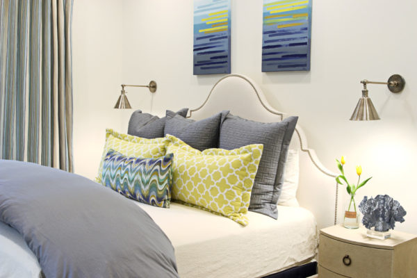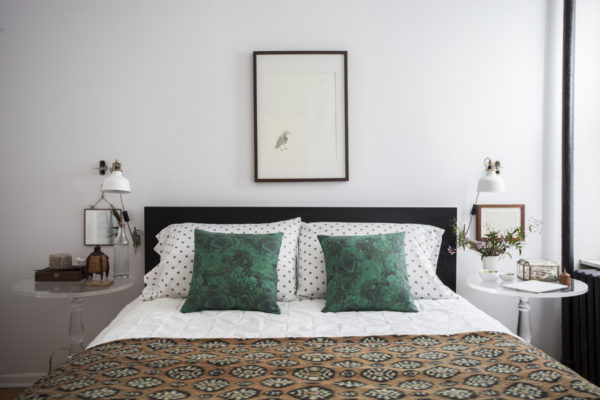 - Nous ajoutons deux oreillers lumineux et un blanc avec un imprimé floral au lit principal.