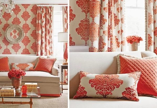 Les tons corail sont inclus dans les nuances à la mode de 2019 - une combinaison d'orange et de rouge, mais sous une forme plus élégante. De tels oreillers rafraîchiront une pièce décorée de couleur gris-bleu, ou exprimeront la présence de nuances vertes non accrocheuses.
