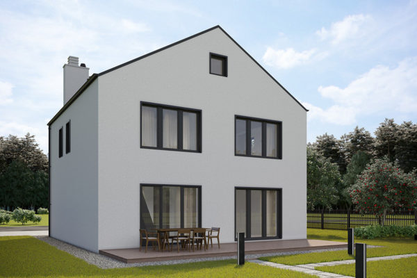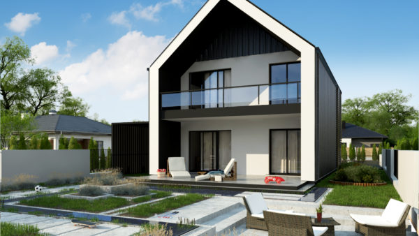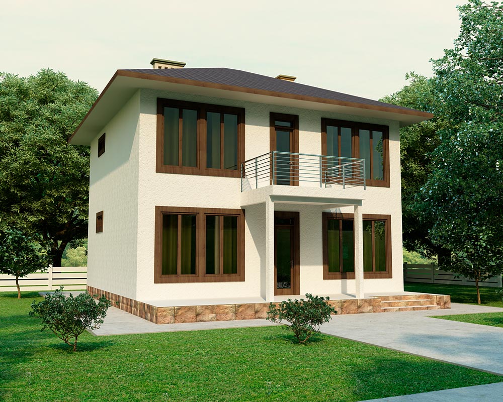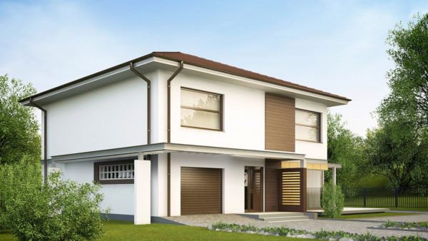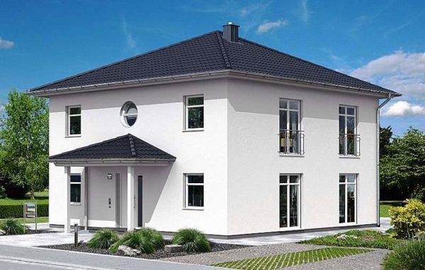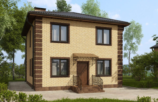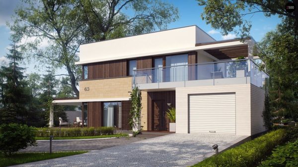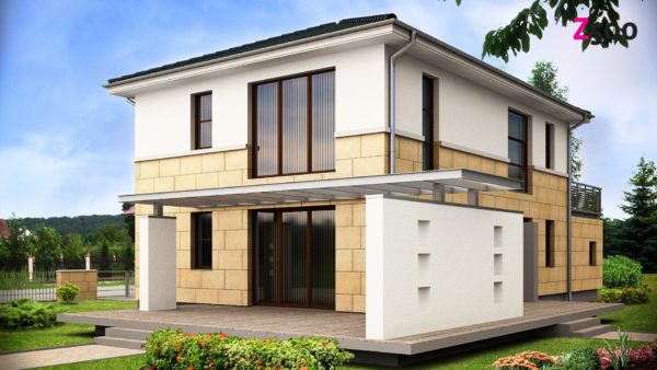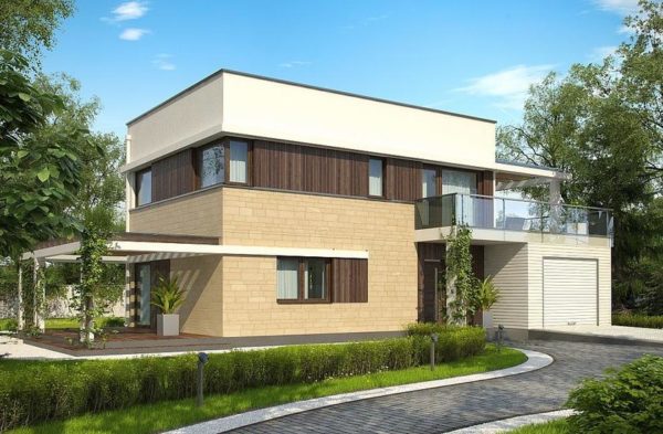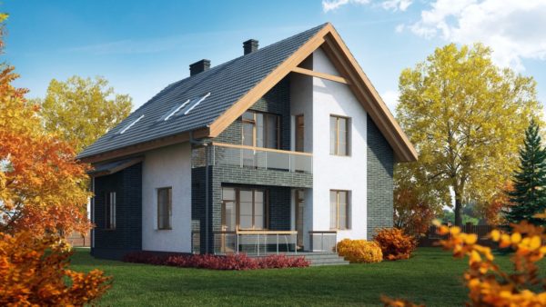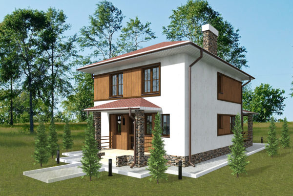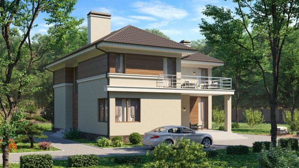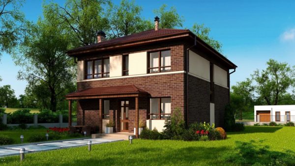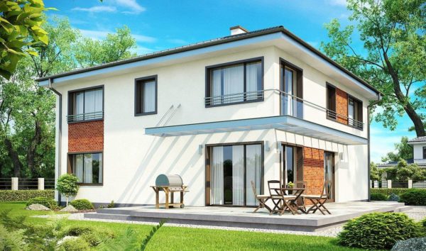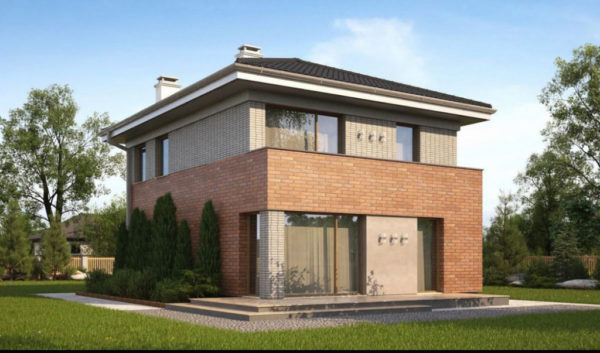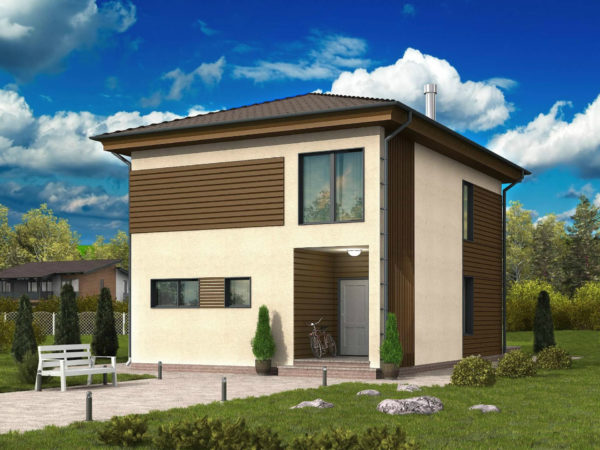 Une maison carrée à deux étages est conçue pour une vie de famille confortable à tout moment de l'année. Le design est dominé par un design simple et une disposition pratique des pièces.