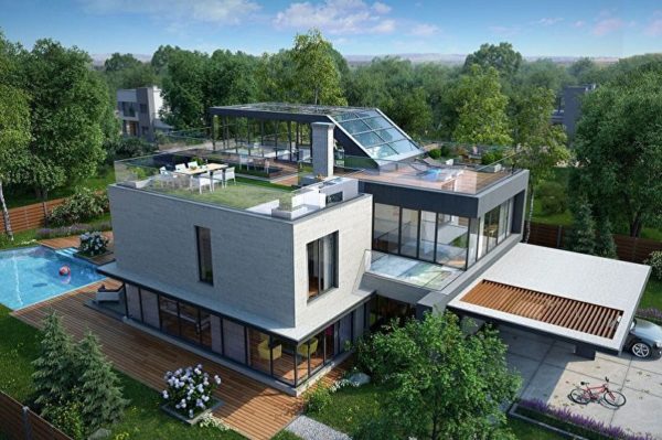 Les éléments décoratifs de la façade sont pratiquement absents. Le toit de la maison hi-tech a une forme plate, sur laquelle vous pouvez équiper une zone de loisirs, une salle de sport, une piscine, etc.: