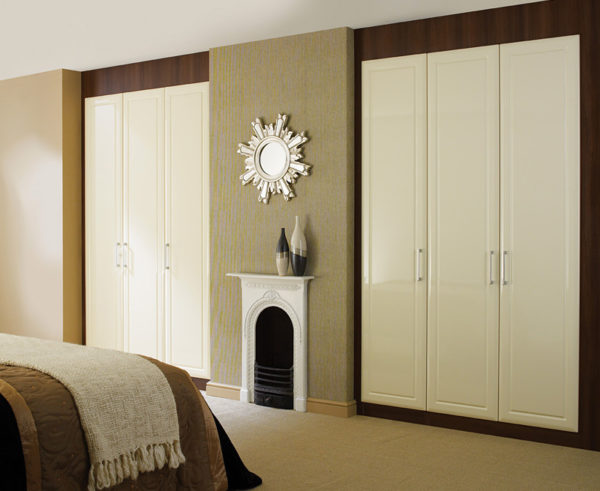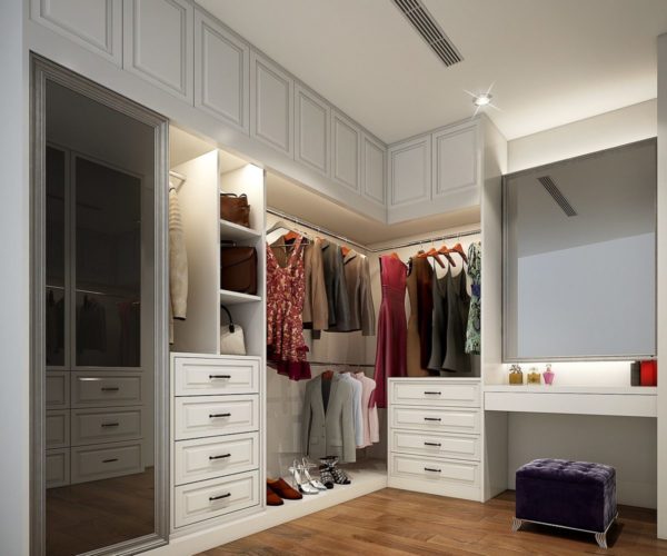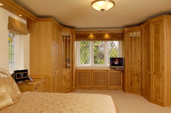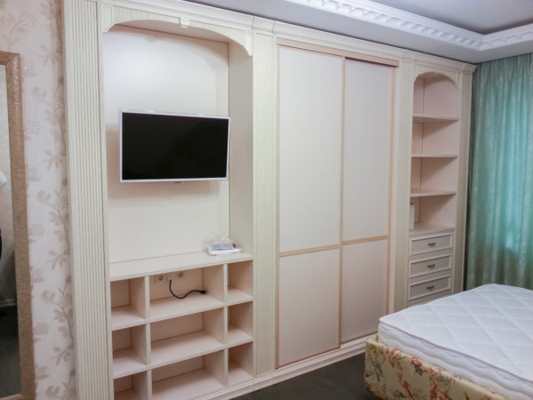 Les armoires sont installées parallèlement au mur, également placées dans des niches. En hauteur, ils occupent généralement tout l'espace du sol au plafond. Les portes sont installées avec des conceptions différentes, elles peuvent être rames ou même compartiment.
