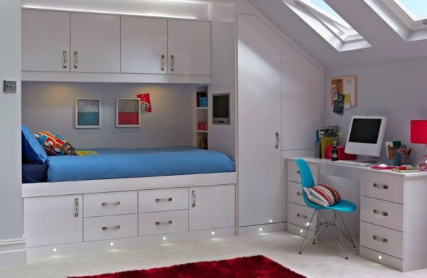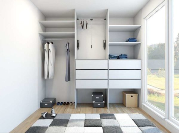 Cela dépend aussi beaucoup de la profondeur du mobilier installé, principalement de 45 cm et même de 60 cm.Pour économiser de l'espace, vous pouvez sacrifier la profondeur, mais en même temps vous pouvez maximiser l'utilisation de toute la hauteur de la pièce.