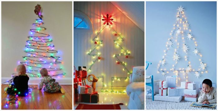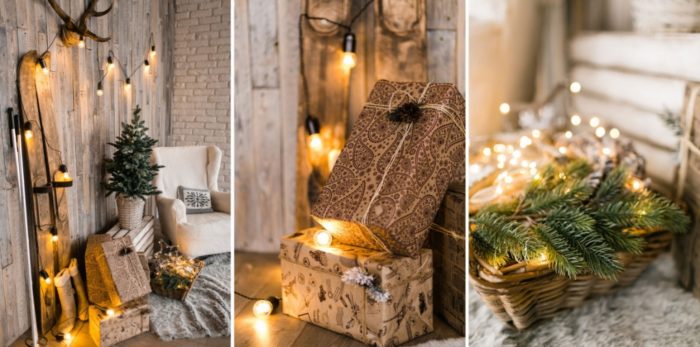 Un élégant sapin de Noël est associé à des cadeaux. Par conséquent, ils sont souvent situés précisément en dessous, joliment décorés avant même l'arrivée des invités. L'intérieur du nouvel an de la pièce bénéficiera sans aucun doute de la présence de ces éléments décoratifs lumineux.
