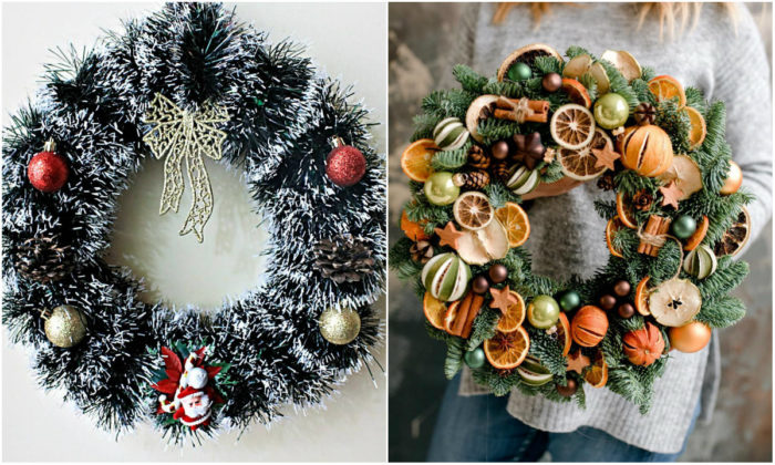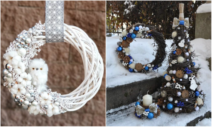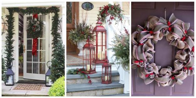 Avec une décoration extérieure, il vaut vraiment la peine de décorer la porte d'entrée de la maison, car sa décoration affecte l'opinion des propriétaires de la maison. La porte et le porche doivent être décorés avec divers équipements d'éclairage, en particulier des guirlandes électriques enroulées autour de branches d'épinette ou de pin (à partir desquelles vous pouvez construire une couronne). Vous pouvez également décorer la porte et le porche avec de grands noeuds en satin rouge.