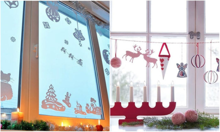 Sous les rebords de fenêtre ou au-dessus des fenêtres, vous pouvez accrocher des chaussettes de vacances pour les cadeaux. Quelques jours avant le nouvel an, vous pouvez y mettre de petits cadeaux pour toute la famille. Cela apportera encore plus d'humeur aux vacances. Les chaussettes doivent être choisies dans un tissu dense de couleurs rouges ou vertes.