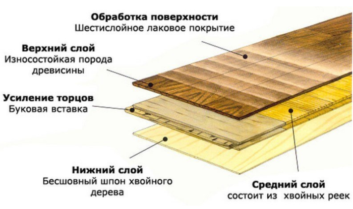 - Il est composé de bois naturel de haute qualité. La couche supérieure est assez durable, car ils utilisent plus souvent que les autres chêne, frêne, hêtre. Les couches inférieures sont principalement en bois tendre.