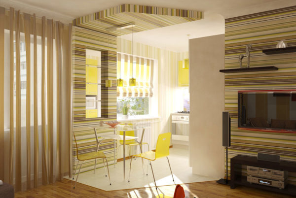 Il est nécessaire de diviser le lieu en plusieurs zones où le processus de cuisson, l'accueil des invités aura lieu. Il est nécessaire d'ériger un mur dans la pièce afin de cacher le lit derrière et de préparer le reste pour une pépinière. Abandonner le lustre central au profit de lampes de table, lampadaires, appliques ou petits plafonniers.