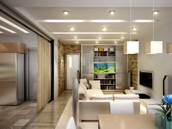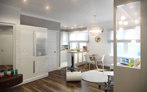 Il est nécessaire de diviser le lieu en plusieurs zones où le processus de cuisson, l'accueil des invités aura lieu. Il est nécessaire d'ériger un mur dans la pièce afin de cacher le lit derrière et de préparer le reste pour une pépinière. Abandonner le lustre central au profit de lampes de table, lampadaires, appliques ou petits plafonniers.
