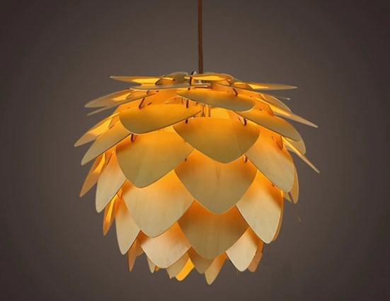 La lampe est en bois, répète entièrement le cône en forme. La conception fermée donne un éclairage facile, donc cette lampe convient comme source d'éclairage supplémentaire. Une pomme de pin en bois sera un merveilleux élément de l'intérieur de la cuisine. Le coût d'une telle lampe est d'environ 5000 roubles.