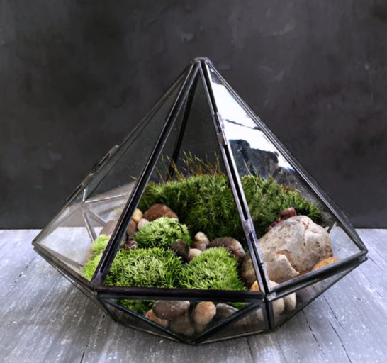 Le terrarium est en verre en forme de diamant. À l'intérieur, vous pouvez mettre de la mousse, des pierres, de petites plantes. Le terrarium géométrique deviendra un coin de nature dans la maison. Vous pouvez y mettre vos plantes préférées et obtenir un meuble unique. Le coût du terrarium n'est que de 2300 roubles.