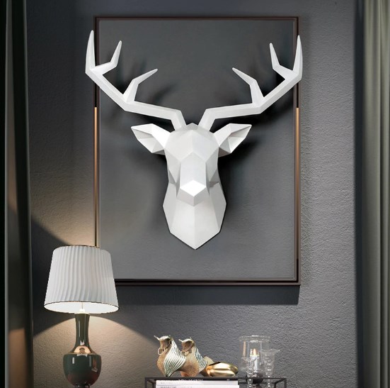 Une large sélection de sculptures en forme de cerfs, loups, ours, éléphants et autres animaux sauvages est présentée. Les sculptures sont également présentées dans différents schémas de couleurs. La statue est de petite taille et de poids en résine, elle peut être placée sur le mur. Le coût de la décoration est de 1700 roubles.
